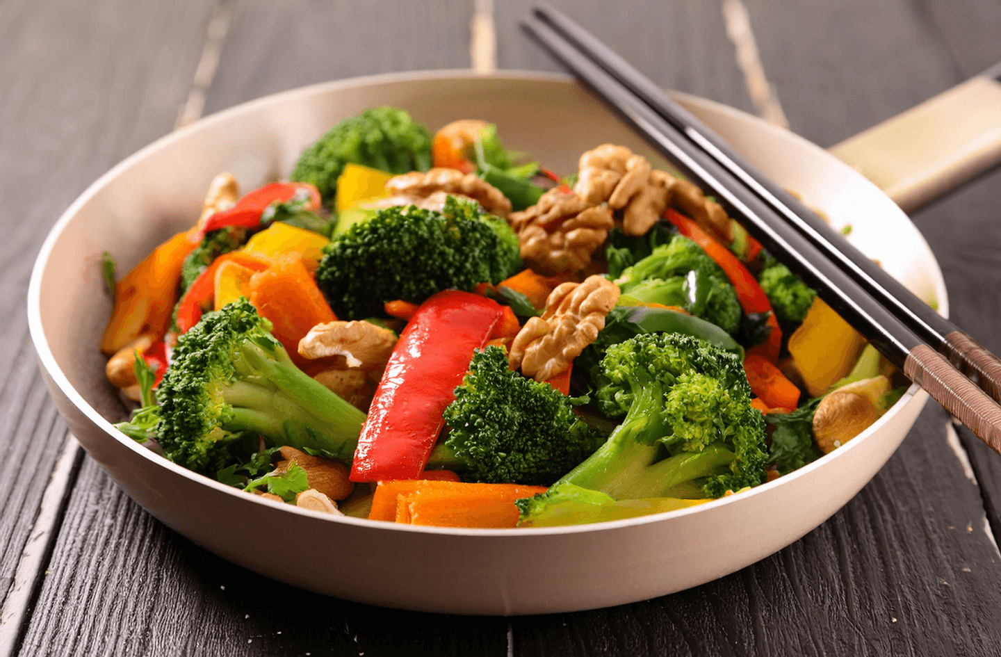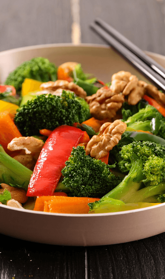 Pfannengericht mit Brokkoli, Walnuss und Zucchini