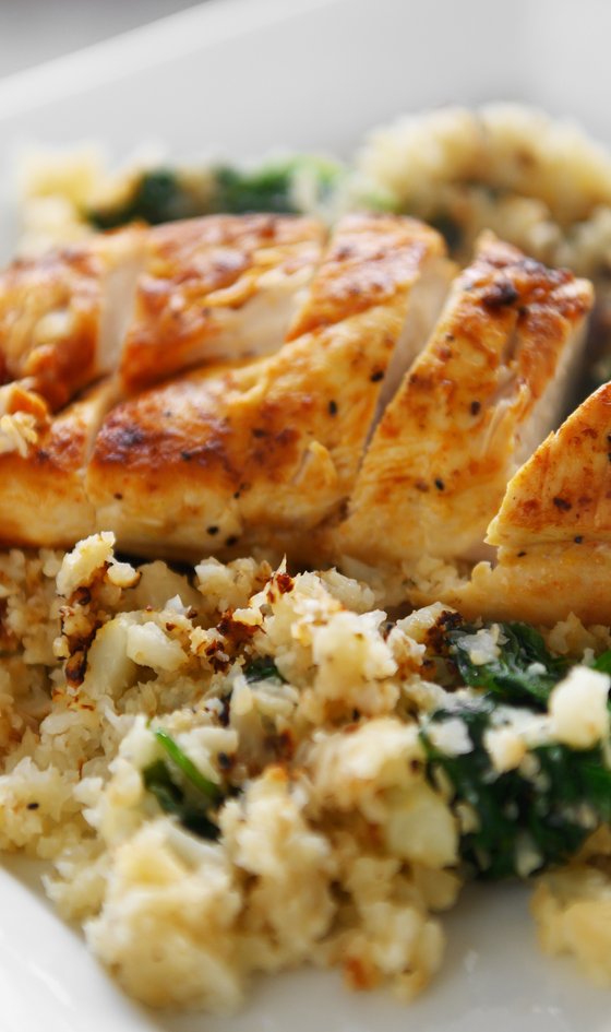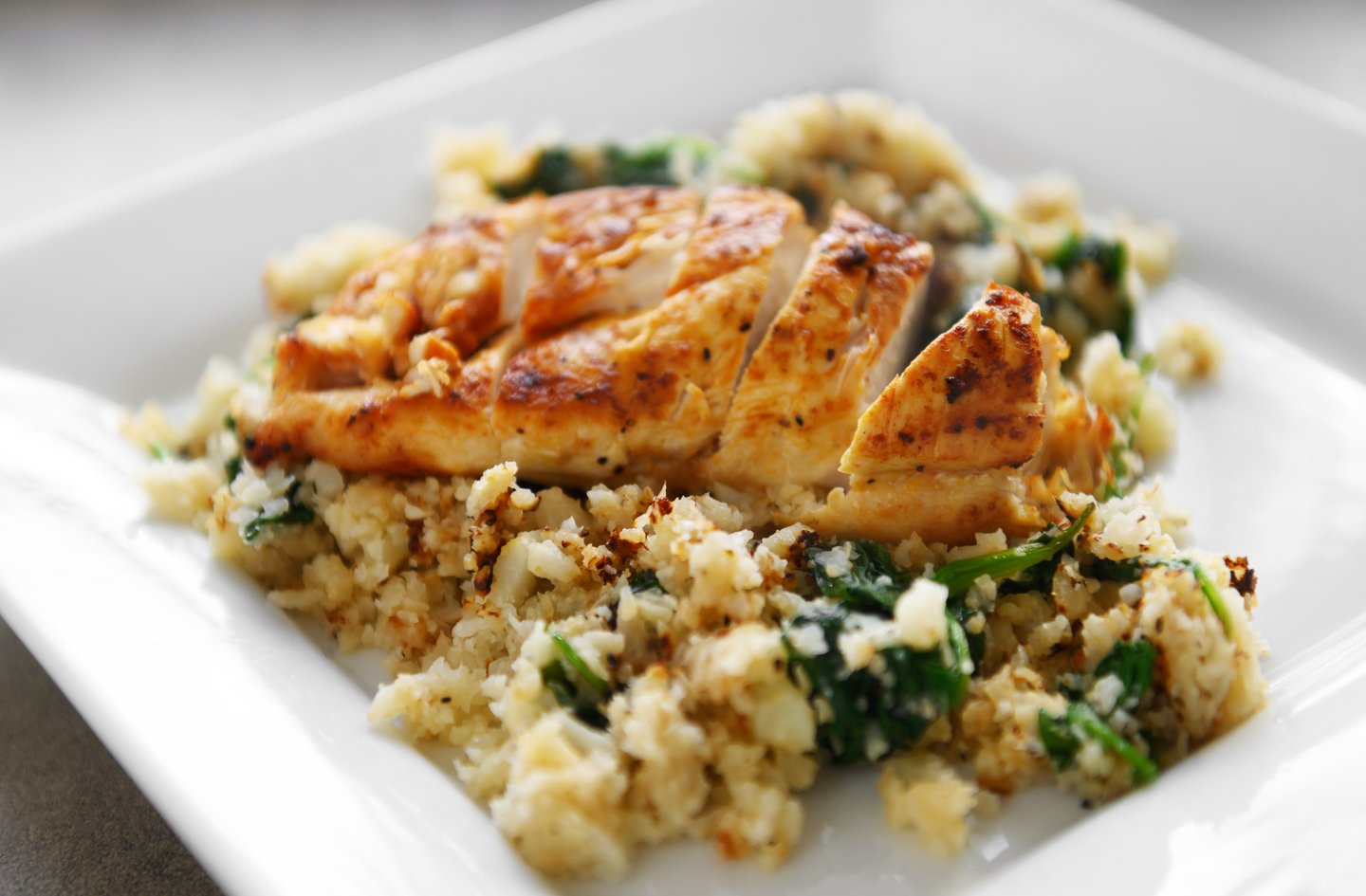 Slice the chicken and serve it over the ‘rice’, garnished with fresh coriander.