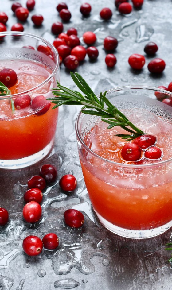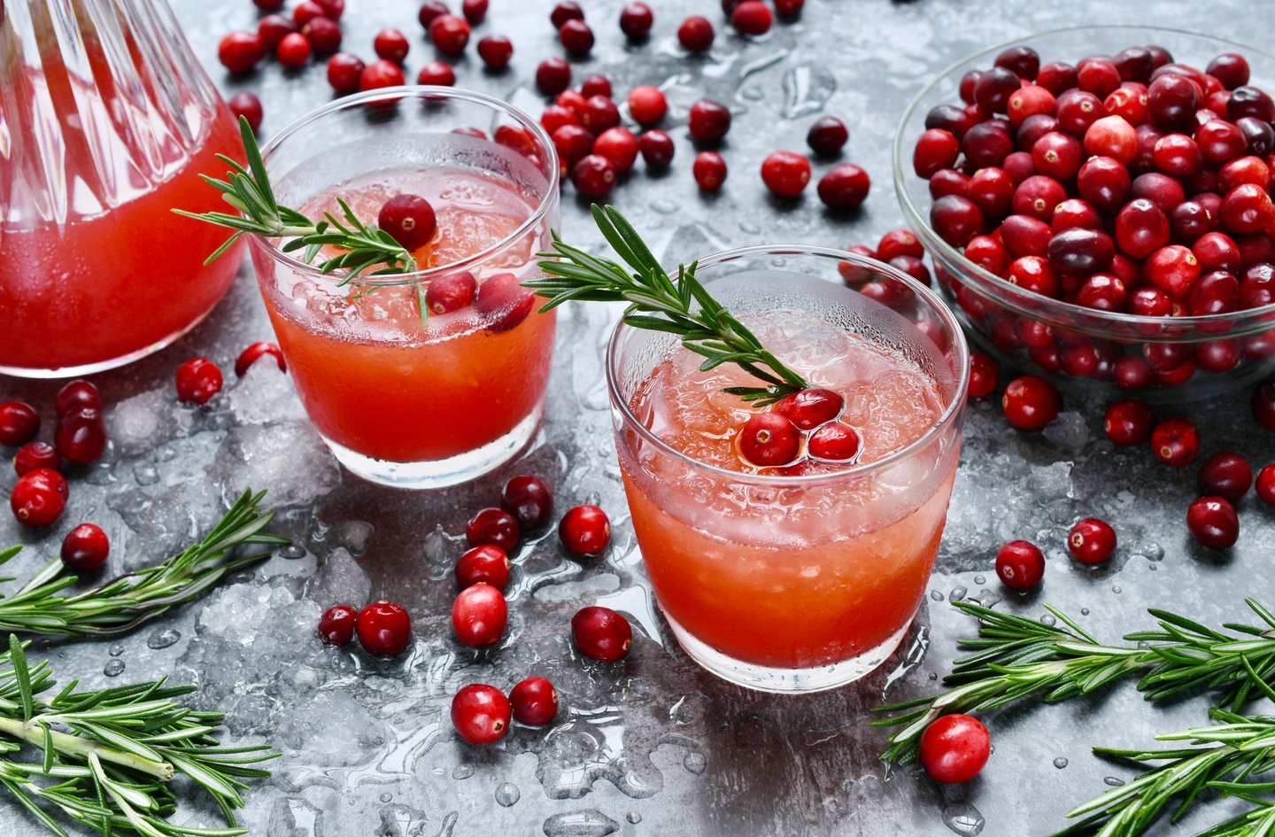 Glaçons, pailles rayées, feuilles de menthe fraîche et une poignée de cranberries fraîches (facultatif)