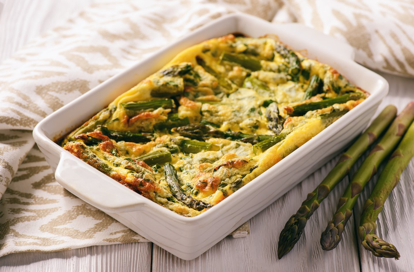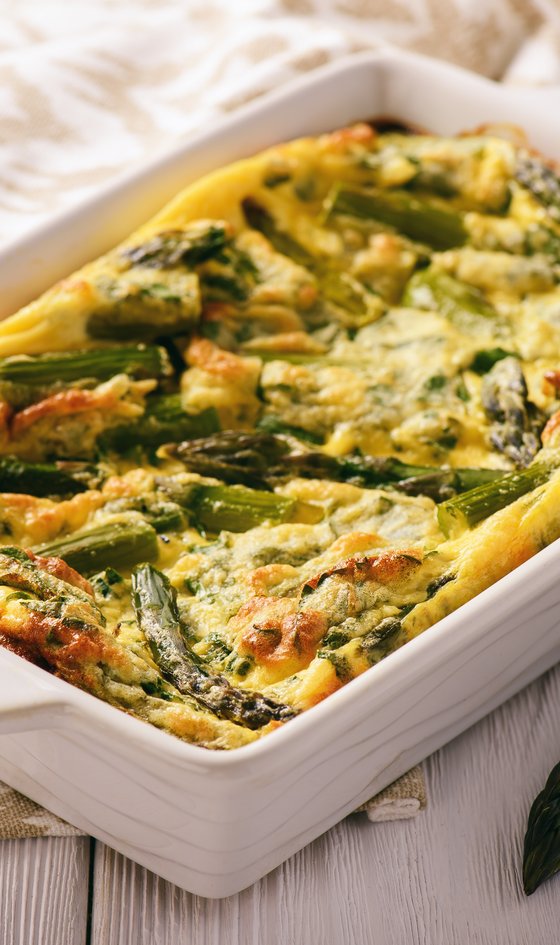 Spargel in die Pfanne geben und gleichmäßig verteilen, dann die Eiermasse hinzugeben. 3–4 Minuten kochen lassen, bis die Ränder fest werden, aber nicht an der Pfanne kleben.