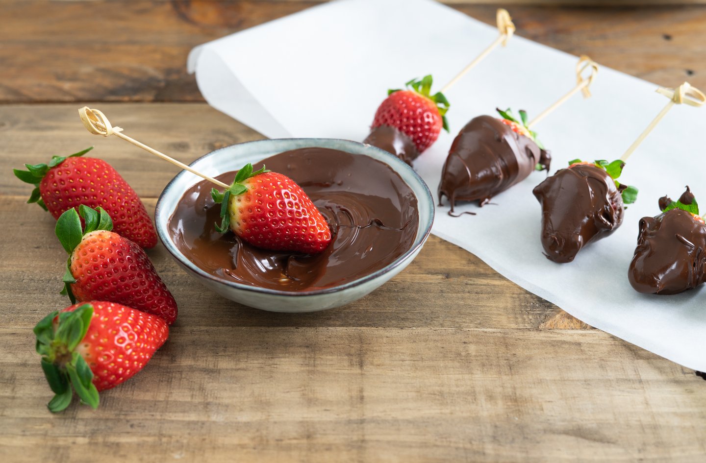 Überschüssige Schokolade abtropfen lassen und jede in Schokolade getauchte Erdbeere auf das Backpapier legen.
