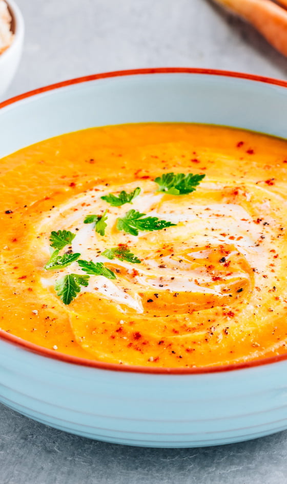 Erneut erhitzen und die Suppe auf Serviertemperatur bringen, dann mit einer Kelle auf Suppenschüsseln verteilen. Je nach Wunsch mit Crème fraîche, Koriander, Chilli oder allem garnieren.