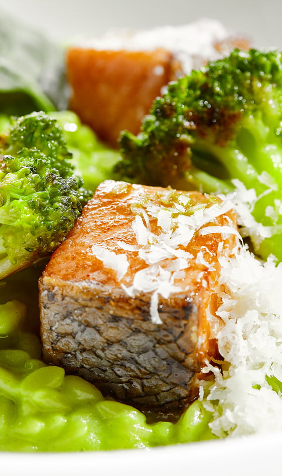 Den Reis mit einer Gabel auflockern, dann auf einem Teller mit dem Miso-Lachs mit etwas grünem Gemüse anrichten und mit frischem Koriander, Sesamsamen oder Frühlingszwiebel garnieren.
