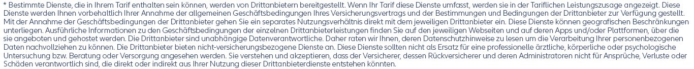 * Bestimmte Dienste, die in Ihrem Tarif enthalten sein können, werden von Drittanbietern bereitgestellt. Wenn Ihr Tarif diese Dienste umfasst, werden sie in der Tariflichen Leistungszusage angezeigt. Diese Dienste werden Ihnen vorbehaltlich Ihrer Annahme der allgemeinen Geschäftsbedingungen Ihres Versicherungsvertrags und der Bestimmungen und Bedingungen der Drittanbieter zur Verfügung gestellt. Mit der Annahme der Geschäftsbedingungen der Drittanbieter gehen Sie ein separates Nutzungsverhältnis direkt mit dem jeweiligen Drittanbieter ein. Diese Dienste können geografischen Beschränkungen unterliegen. Ausführliche Informationen zu den Geschäftsbedingungen der einzelnen Drittanbieterleistungen finden Sie auf den jeweiligen Webseiten und auf deren Apps und/oder Plattformen, über die sie angeboten und gehostet werden. Die Drittanbieter sind unabhängige Datenverantwortliche. Daher raten wir Ihnen, deren Datenschutzhinweise zu lesen um die Verarbeitung Ihrer personenbezogenen Daten nachvollziehen zu können. Die Drittanbieter bieten nicht-versicherungsbezogene Dienste an. Diese Dienste sollten nicht als Ersatz für eine professionelle ärztliche, körperliche oder psychologische Untersuchung bzw. Beratung oder Versorgung angesehen werden. Sie verstehen und akzeptieren, dass der Versicherer, dessen Rückversicherer und deren Administratoren nicht für Ansprüche, Verluste oder Schäden verantwortlich sind, die direkt oder indirekt aus Ihrer Nutzung dieser Drittanbieterdienste entstehen könnten.
