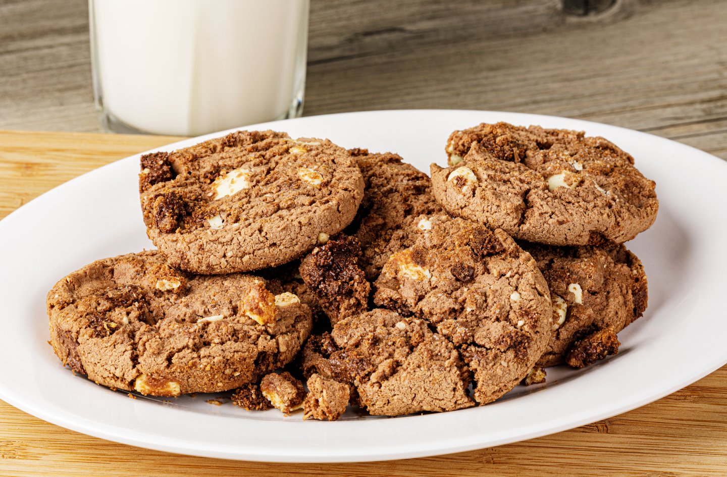 Misture a farinha de amêndoas, o bicarbonato de sódio, o sal e as lascas de chocolate, nozes ou frutas secas opcionais em uma tigela.